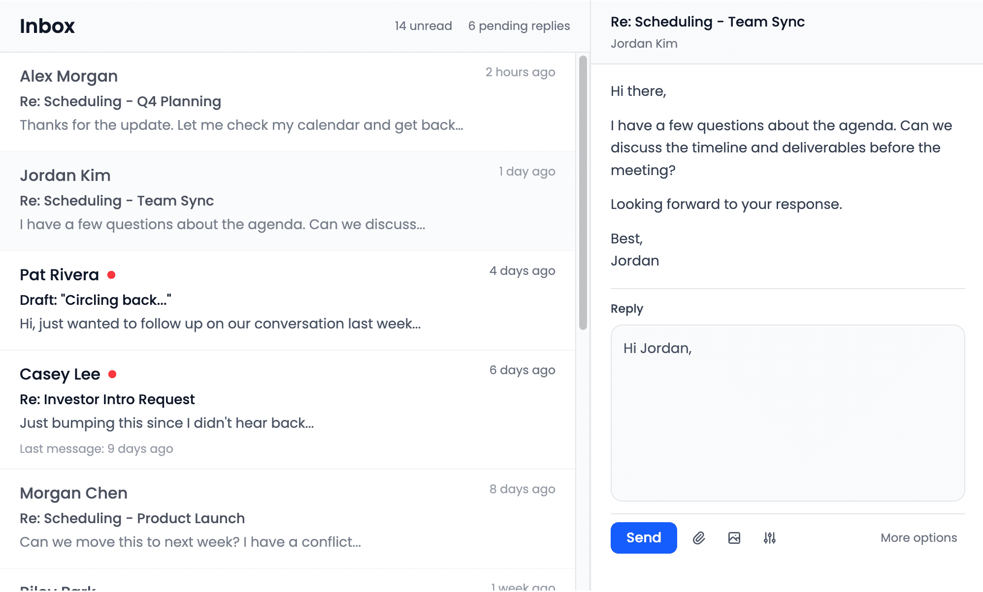 You spend more time chasing replies than doing the work that matters. Every meeting request becomes a thread to track, remember, and follow up on — sometimes for days.